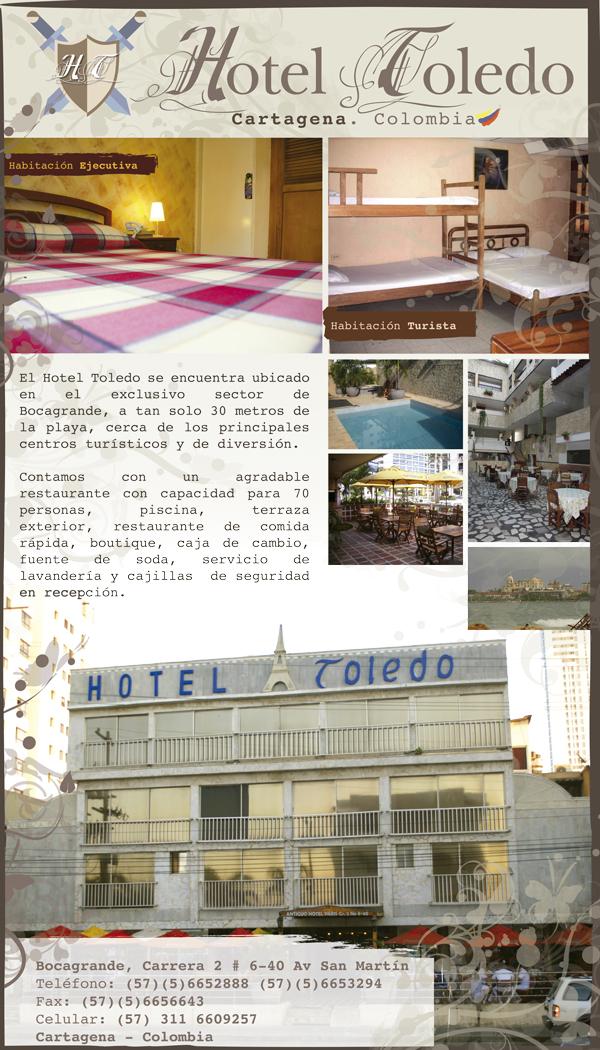 Realizamos el diseño y la impresión de 6 pendondes de 40 x 70 cms para el Hotel Toledo en la ciudad de Cartagena (Colombia). El diseño se realizó basados en la imagen del sitio web y buscando reforzar la imagen corporativa, mientras se muestra de una manera gráfica cada uno de los servicios del hotel.